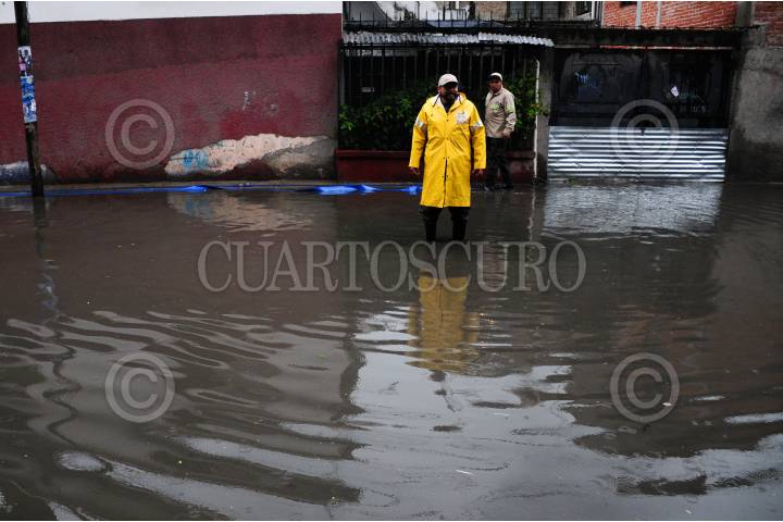 Un trabajador de protección civil camina por una de las calles inundadas de la colonia.