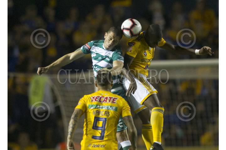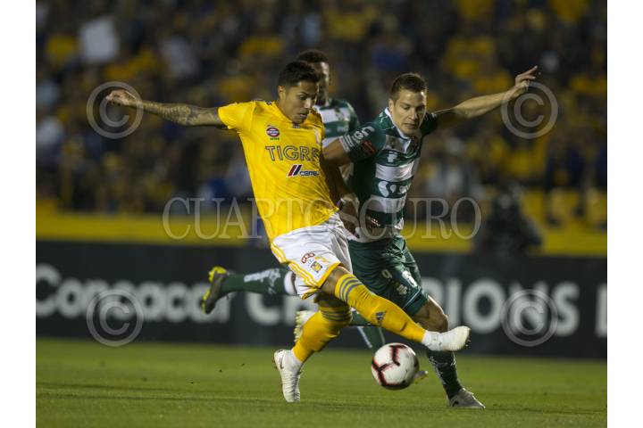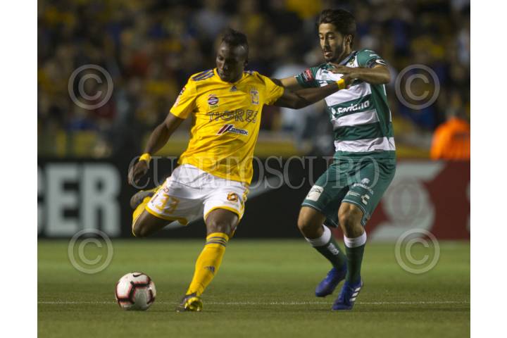 MONTERREY, NUEVO LEÓN, 03ABRIL2019.- Luis Quiñones del equipo de los Tigres de la UANL, se disputa el balón con Jesús Angulo del equipo de Santos, en el estadio Universitario, partido correspondiente a la Semifinal de ida de la Concacaf, Liga de Campeones 2019. Marcador Final: Tigres: 3 - Santos: 0 FOTO: GABRIELA PÉREZ MONTIEL /CUARTOSCURO.COM