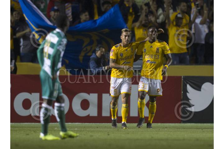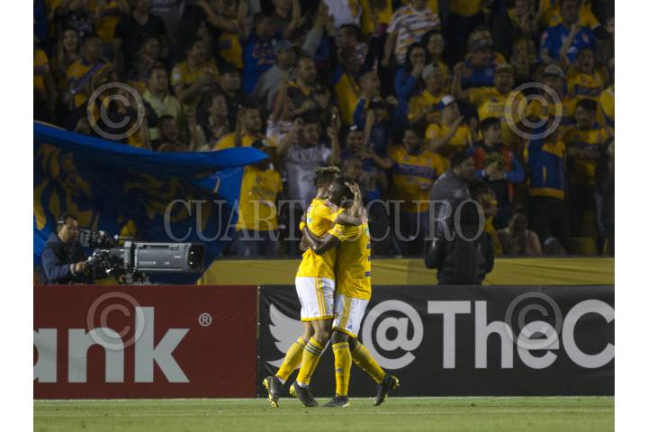 MONTERREY, NUEVO LEÓN, 03ABRIL2019.- Jugadores del equipo de los Tigres de la UANL, celebran el gol ante el equipo de Santos, en el estadio Universitario, partido correspondiente a la Semifinal de ida de la Concacaf, Liga de Campeones 2019. Marcador Final: Tigres: 3 - Santos: 0 FOTO: GABRIELA PÉREZ MONTIEL /CUARTOSCURO.COM