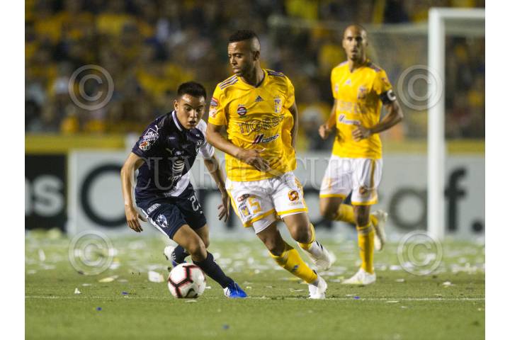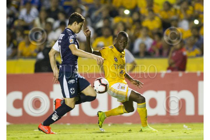 MONTERREY, NUEVO LEÓN, 23ABRIL2019.- Luis Quiñones del equipo de los Tigres de la UANL, se disputa el balón con Stefan Medina del equipo de los Rayados del Monterrey, en el estadio Universitario, partido correspondiente a la Final de ida de la Concacaf, Liga de Campeones 2019. Marcador Final: Tigres: 0 - Monterrey: 1 FOTO: GABRIELA PÉREZ MONTIEL /CUARTOSCURO.COM