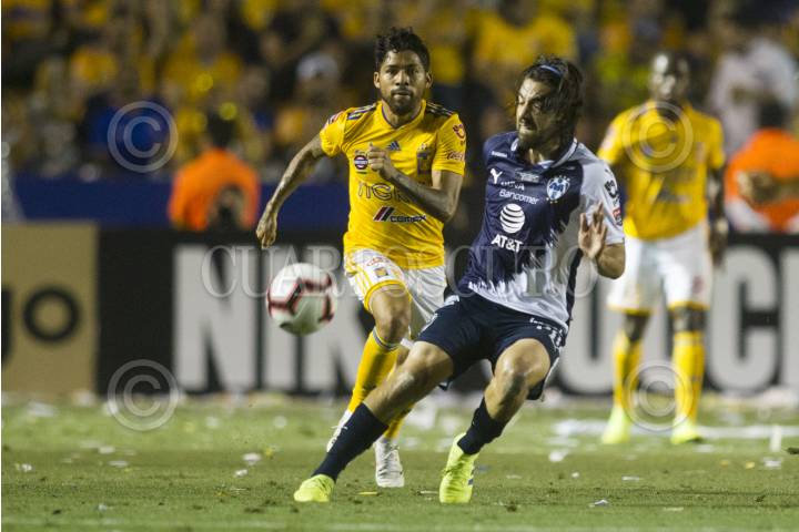 MONTERREY, NUEVO LEÓN, 23ABRIL2019.- Rafael Carioca del equipo de los Tigres de la UANL, se disputa el balón con Carlos Rodríguez del equipo de los Rayados del Monterrey, en el estadio Universitario, partido correspondiente a la Final de ida de la Concacaf, Liga de Campeones 2019. Marcador Final: Tigres: 0 - Monterrey: 1 FOTO: GABRIELA PÉREZ MONTIEL /CUARTOSCURO.COM