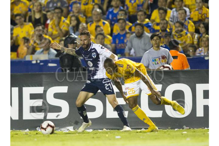 MONTERREY, NUEVO LEÓN, 23ABRIL2019.- Luis Quiñones del equipo de los Tigres de la UANL, se disputa el balón con Miguel Layún del equipo de los Rayados del Monterrey, en el estadio Universitario, partido correspondiente a la Final de ida de la Concacaf, Liga de Campeones 2019. Marcador Final: Tigres: 0 - Monterrey: 1 FOTO: GABRIELA PÉREZ MONTIEL /CUARTOSCURO.COM