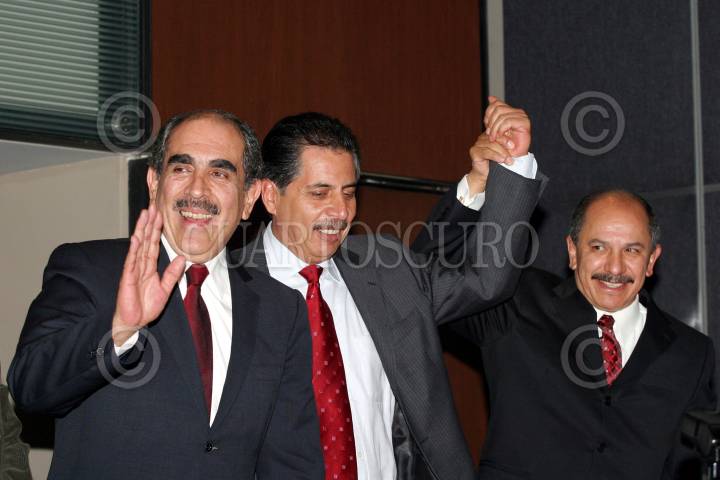 MEXICO, DF .-29SEPTIEMBRE2005.- Los integrantes del TUCOI, todos unidos con la izquierda, Pablo Gómez, Jesús Ortega y Armando Quintero luego de conocer los resultados de la encuesta, que ganó , Jesús Ortega; Pablo Gómez se negó a levantar la mano al ganador, "ni que fuera luchador", dijo el diputado federal. FOTO: Miguel Dimayuga/CUARTOSCURO.COM