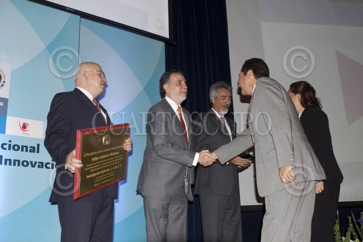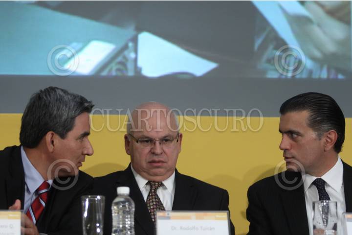 MÉXICO, D.F., 13ENERO2012.- Rodolfo Tuirán Gutiérrez, subsecretario de Educación Superior, Bruno Ferrari, secretario de Economía, y Enrique Villa Rivera, director del Conacyt, entregaron el Premio Nacional de Innovación Tecnológica en la sede de la SE. FOTO: MOISÉS PABLO/CUARTOSCURO.COM