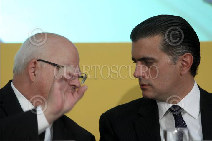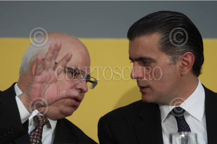 MÉXICO, D.F., 15DICIEMBRE2010.- Rodolfo Tuirán, subsecretario de Educación Superior conversa con Alonso Lujambio, secretario de Educación Pública durante la entrega de reconocimientos a Instituciones de Educación Universitaria por la buena calidad en sus programas que se realizo en el patio central de la SEP. FOTO: RODOLFO ANGULO/CUARTOSCURO.COM