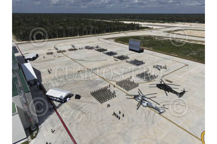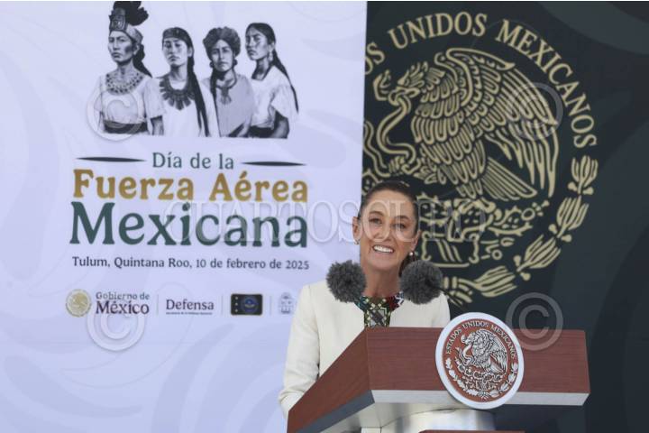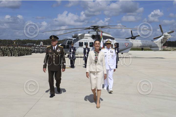 TULUM, QUINTANA ROO, 10FEBRERO2025.- Claudia Sheinbaum, Presidenta de México, encabezó la inauguración de la Base Aérea Militar No. 20 en el marco del 110 Aniversario de la Fuerza Aérea Mexicana. La acompañaron Ricardo Trevilla Trejo; secretario de la Defensa Nacional; Óscar René Rubio, comandante de la Fuerza Aérea Mexicana; y Raymundo Pedro Morales Ángeles, secretario de Marina. FOTO: PRESIDENCIA/CUARTOSCURO.COM