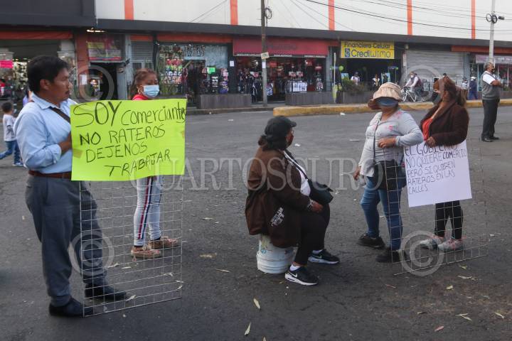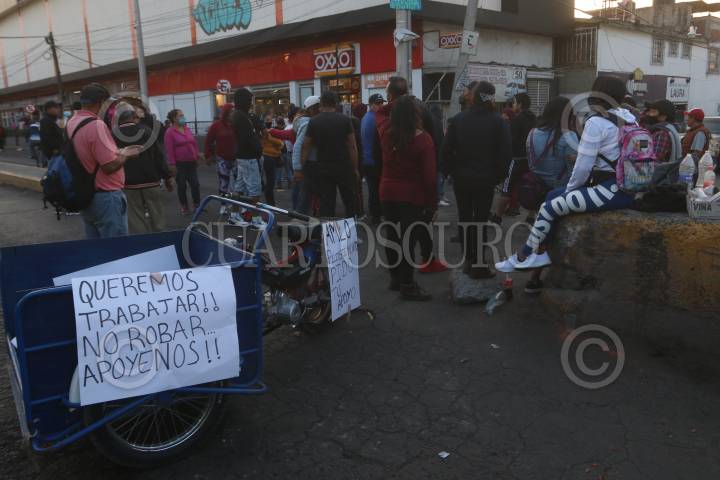 Un grupo de comerciantes mantiene un bloqueo en la Avenida Tláhuac-Tulyehualco en el que exigen que los dejen trabajar porque desde hace seis meses les niegan el espacio para que puedan colocar sus puestos y vender