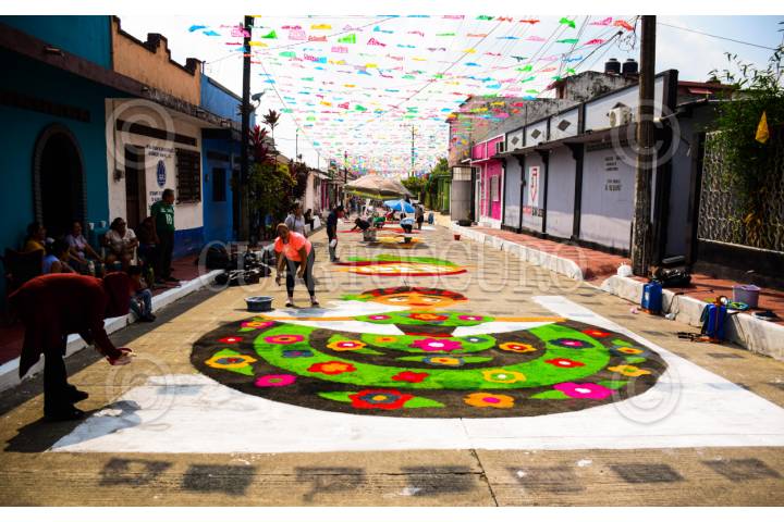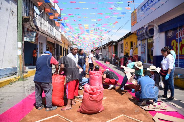 TUXTLA CHICO, CHIAPAS. 02FEBRERO2024.- Feligres elaboran alfombras de acerrirn. Figuras religiosas son elaboradas por religiosos del municipio de Tuxtla Chico, pasara la peligrincion de la virgen de Concepción. Para las elaboración de las figuras se llevan varios días, primero consiguen costales de acerrin para colorear de diferentes tonos. FOTO: DAMIÁN SÁNCHEZ/CUARTOSCURO.COM
