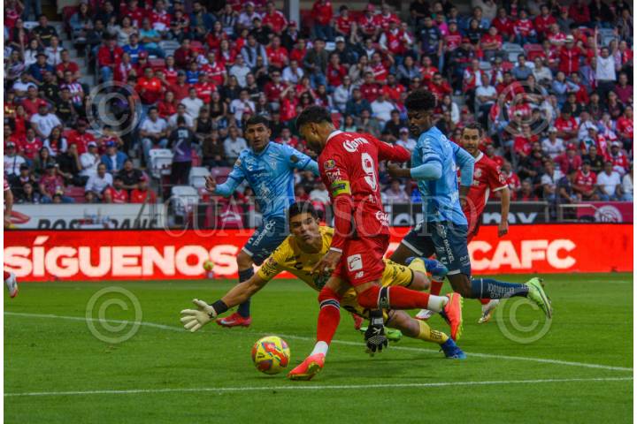 TOLUCA, ESTADO DE MÉXICO, 29MARZO2025.- Alexis Vega delantero de Diablos de Toluca y Carlos Moreno portero de los Tuzos de Pachuca, partido correspondiente a la jornada 13 del Torneo Clausura 2025 de la Liga MX, con un marcador final 3-2. FOTO: CRISANTA ESPINOSA AGUILAR /CUARTOSCURO.COM