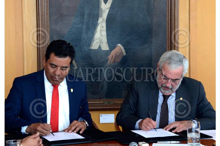 CIUDAD DE MÉXICO, 29ABRIL2019.- La UNAM contribuirá a fortalecer los sistemas de educación abierta y a distancia de la Universidad Autónoma “Benito Juárez” de Oaxaca (UABJO), y ambas instituciones promoverán el intercambio de estudiantes de posgrado y de académicos. Mediante un convenio de colaboración suscrito por el rector Enrique Graue Wiechers y su homólogo de la institución oaxaqueña, Eduardo Bautista Martínez, la Universidad Nacional brindará asesorías para implementar los procesos de inscripción de alumnos de nuevo ingreso mediante el uso de Internet, y se establecerá la Unidad de Evaluación Académica. La firma del instrumento de colaboración de realizó en la Torre de Rectoría, donde Graue Wiechers expresó el apoyo total de la Universidad de la nación a la UABJO en esta tarea educativa. En tanto, Bautista Martínez destacó que en conjunto con la UNAM se imparten siete licenciaturas en línea, y el apoyo es importante porque la UABJO abrirá nuevos centros de educación a distancia en el Istmo de Tehuantepec, para ampliar la cobertura en educación superior, particularmente en las zonas rurales de Oaxaca. FOTO: UNAM /CUARTOSCURO.COM