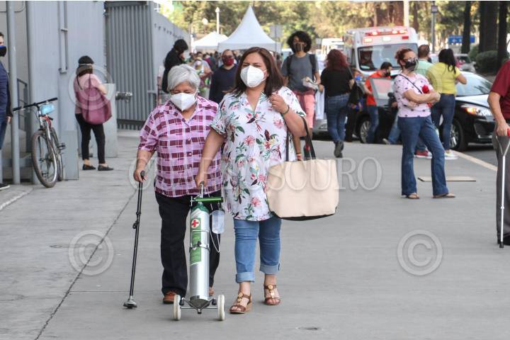 Una mujer con tanque de oxígeno, acompañada de un familiar a su llegada a la Arena Ciudad de México.