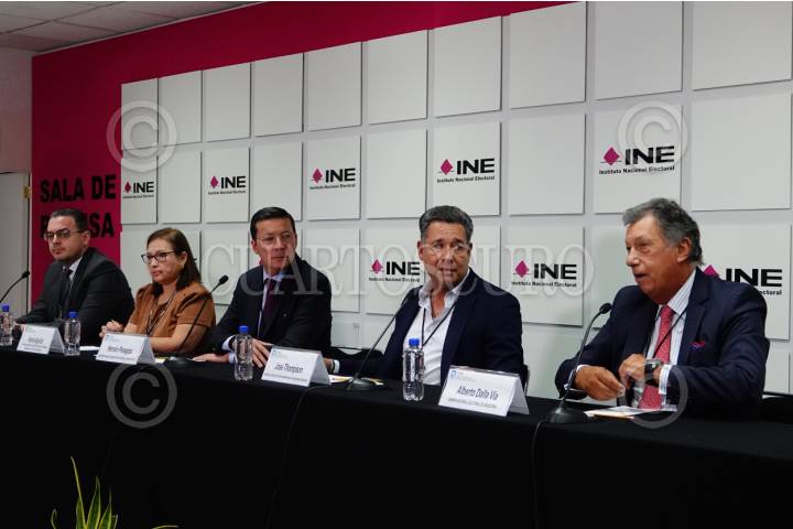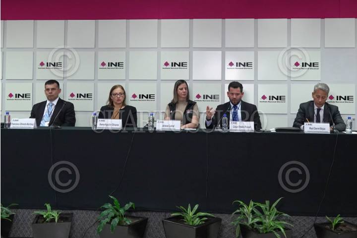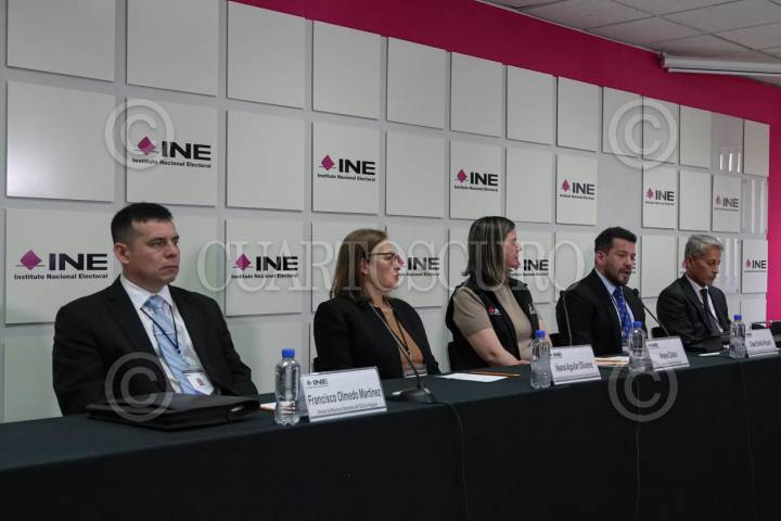 CIUDAD DE MÉXICO 02MAYO2025.- Francisco Olmedo, Ileana Aguilar, Arlene Carnal, Cedar Rossel y Rayin Bejas, integrantes de la Misión de Acompañamiento Internacional de la Unión Interamericana de Organismos Electorales (UNIORE), durante la conferencia a medios de comunicación desde la Sala de Prensa del Instituto Nacional Electoral. FOTO:ROGELIO MORALES/CUARTOSCURO.COM