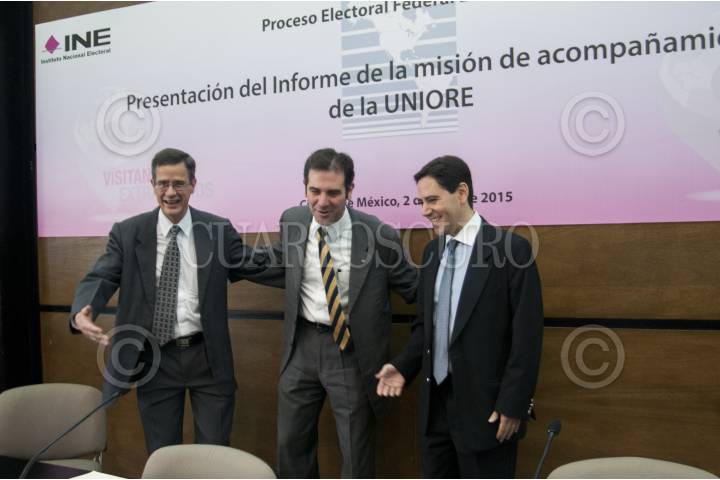 MÉXICO, D.F., 02JULIO2015.- El magistrado Luis Antonio Sobrado, presidente del Tribunal Supremo Electoral de Costa Rica; Lorenzo Córdova Vianello, consejero electoral del INE, y Salvador Romero, director de CAPEL y secretario ejecutivo de la Unión Interamericana de Organismos Electorales (UNIORE), durante la presentación del informe de acompañamiento de la UNIORE por el proceso electoral federal en México de los años 2014 y 2015. FOTO: DIEGO SIMÓN SÁNCHEZ /CUARTOSCURO.COM