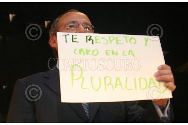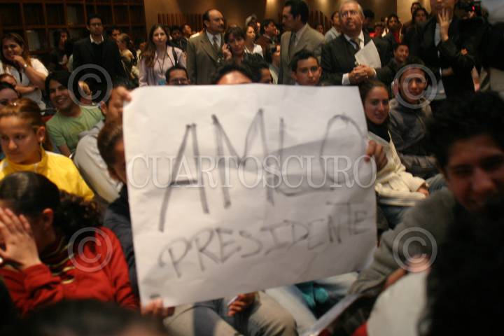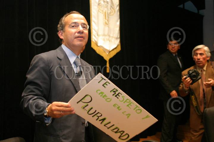 MÉXICO, D.F. 15FEBRREO2006.- Felipe Calderón Hinojosa, candidato presidencial PAN, sostuvo un encuentro con estudiantes del UNITEC campus Cuitláhuac. Después de que algunos alumnos mostraron cartulinas con protestas, el candidato respondió con una pancarta. FOTO:Miriam Sánchez/CUARTOSCURO.COM