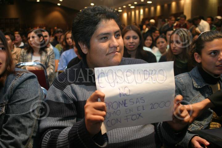 MÉXICO, D.F. 15FEBRREO2006.- Durante la visita del candidato presidencial del PAN, Felipe Calderón Hinojosa a la Universidad Tecnológica de México campus Cuitláhuac algunos alumnos mostraron cartulinas con protestas. FOTO:Miriam Sánchez/CUARTOSCURO.COM