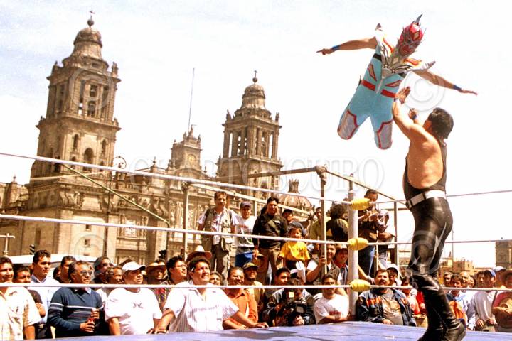 MEXICO, DF 08MARZO2005.- La Unión Campesina Democrática (USD), se manifestó con luchadores sobre un cuadrilátero, en el zócalo capitalino, para exigir la regularización de sus autos. FOTO: OSCAR LOPEZ/CUARTOSCURO.COM