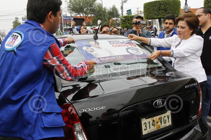 MÉXICO, D.F., 17MAYO2012.- Isabel Miranda de Wallace, candidata del PAN al Gobierno del Distrito Federal, repartió propaganda y pegó calcomanías a automóviles en el cruce de las avenidas Miramontes y Calzada del Hueso, al sur de la ciudad de México. FOTO: ISAAC ESQUIVEL /CUARTOSCURO.COM
