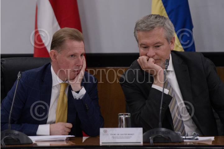 Gunmar Aldén, embajador de Suecia en México, y Gautier Mignot, embajador y jefe de la Delegación de la Unión Europea en México, durante el “Diálogo con embajadores europeos a un año de la invasión rusa en Ucrania”, realizado en el salón del protocolo del Palacio Legislativo de San Lázaro.