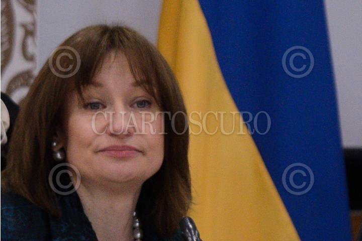 Oksana Dramaretska, embajadora de Ucrania en México, durante el “Diálogo con embajadores europeos a un año de la invasión rusa en Ucrania”, realizado en el salón del protocolo del Palacio Legislativo de San Lázaro.