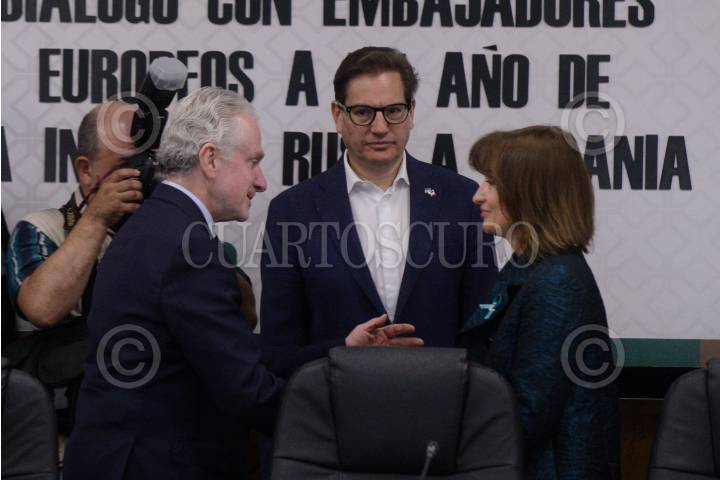 Santiago Creel, presidente de la mesa directiva de la Cámara de Diputados; Salomón Chertorivski, diputado de Movimiento Ciudadano, y Oksana Dramaretska, embajadora de Ucrania en México, durante el “Diálogo con embajadores europeos a un año de la invasión rusa en Ucrania”, realizado en el salón del protocolo del Palacio Legislativo de San Lázaro.