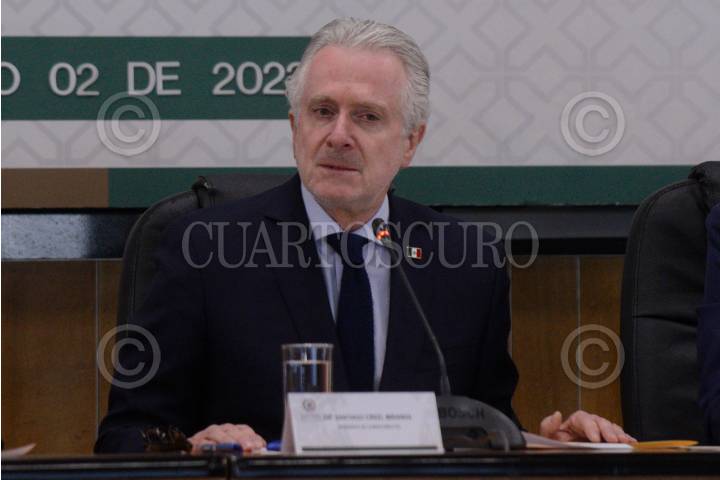 Santiago Creel, presidente de la mesa directiva de la Cámara de Diputados, durante el “Diálogo con embajadores europeos a un año de la invasión rusa en Ucrania”, realizado en el salón del protocolo del Palacio Legislativo de San Lázaro.