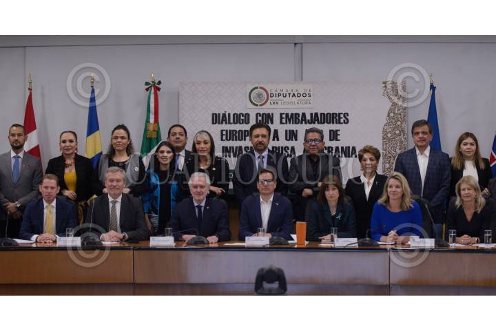 Gunmar Aldén, embajador de Suecia en México; Gautier Mignot, embajador y jefe de la Delegación de la Unión Europea en México; Santiago Creel, presidente de la mesa directiva de la Cámara de Diputados; Salomón Chertorivski, diputado de Movimiento Ciudadano; Oksana Dramaretska, embajadora de Ucrania en México; Ranghild Imerslund, embajadora de Noruega en México, y Päivi Pohjanheilo, embajadora de Finlandia en México, durante el “Diálogo con embajadores europeos a un año de la invasión rusa en Ucrania”, realizado en el salón del protocolo del Palacio Legislativo de San Lázaro.