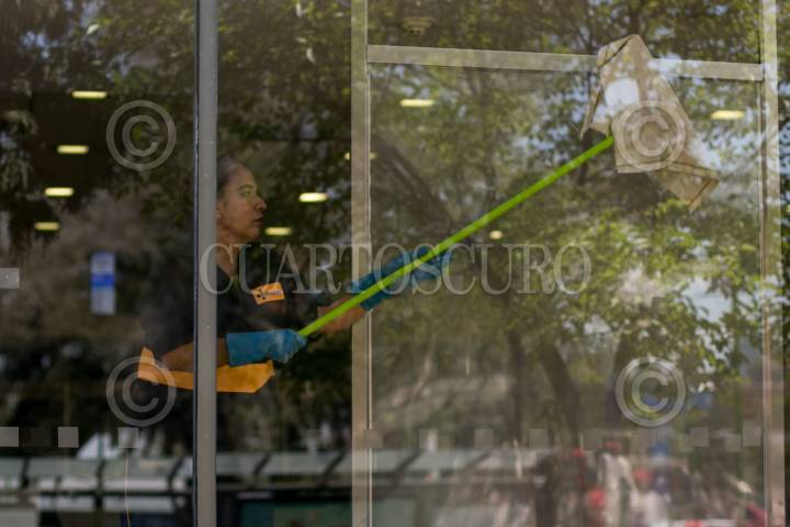 Una trabajadora de limpia labora durante el paro nacional "Jn Día Sin Nosotras".