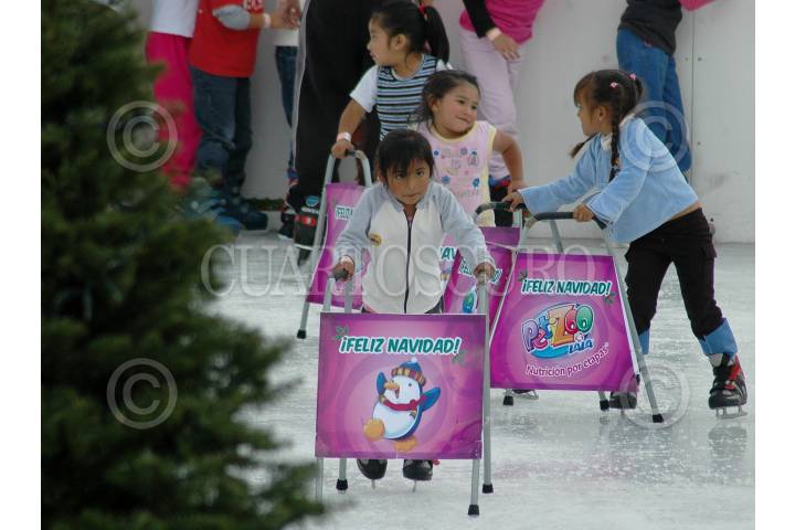 MÉXICO, D.F. 17DICIEMBRE2009.- Niños pequeños disfrutan patinando sobre hielo sosteniéndose del barandal y algunos con ayuda de unas andaderas que los protegen de caídas, esto en la pista para infantes que se encuentra en el Zócalo de la ciudad. FOTO: RODOLFO ANGULO/CUARTOSCURO.COM
