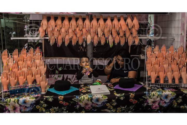 CIUDAD DE MÉXICO, 10JUNIO2018.- Una señora a lado de su hijo ofrece el servicio de uñas postizas en las calles de la capital. FOTO: TERCERO DÍAZ /CUARTOSCURO.COM