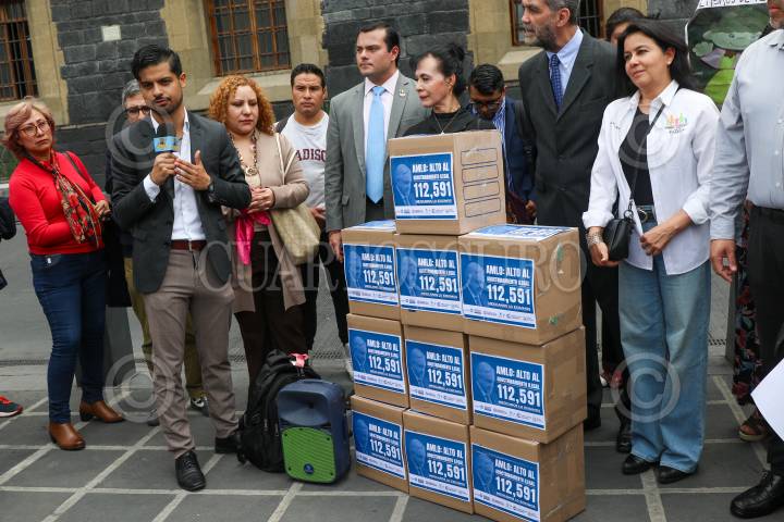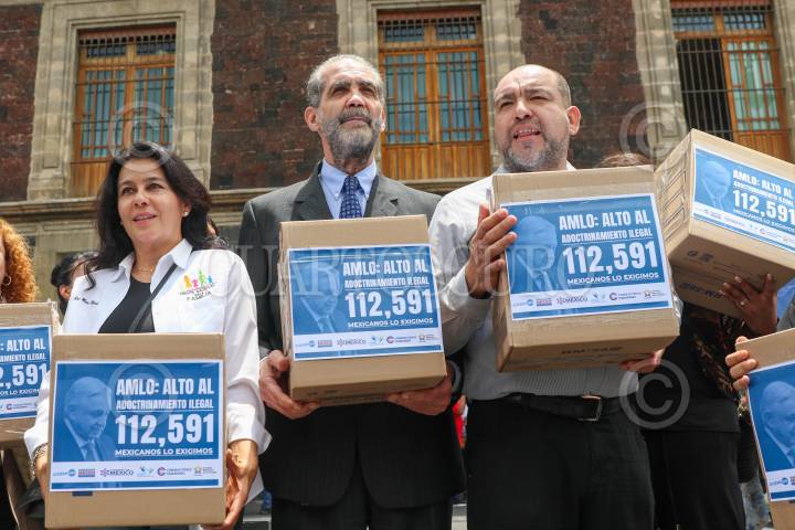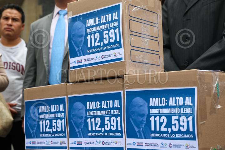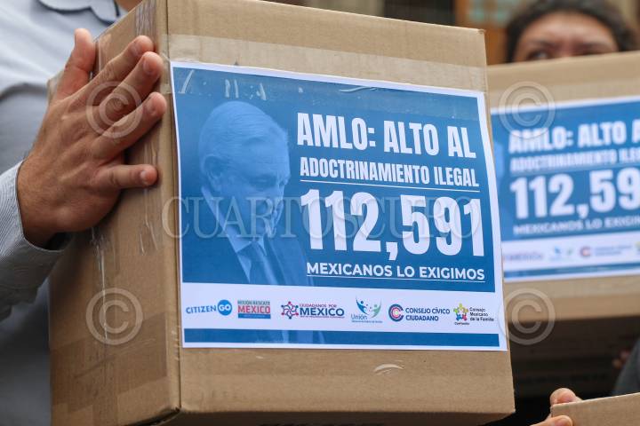 Integrantes de la Unión anacional de Padres de Familia; Plataforma a CitizenGO, y del Consejo Nacional de la Familia, entregaron 112 mil 591 firmas de mexicanos en contra de la distribución de los libros de texto gratuito de la SEP, los cuales tachan de querer adoctrinar a la niñez.