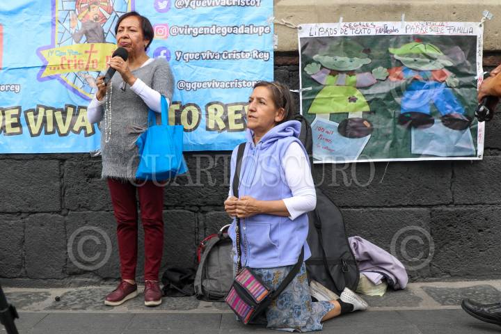 Mujeres rezan afuera de la SEP donde entregaron 112 mil 591 firmas de mexicanos en contra de la distribución de los libros de texto gratuito de la SEP, los cuales tachan de querer adoctrinar a la niñez.