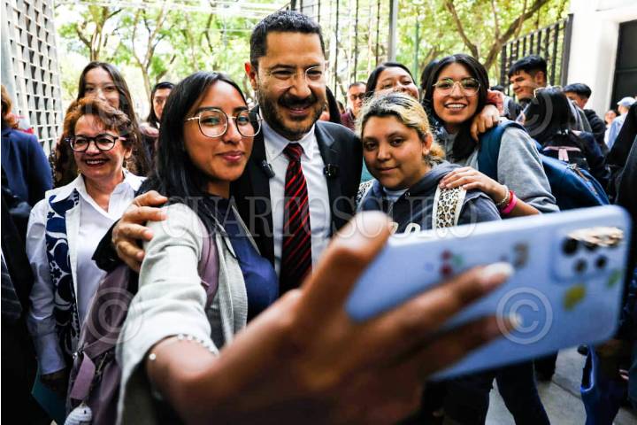 CIUDAD DE MÉXICO, 11SEPTIEMBRE2023.- Martí Batres Guadarrama, Jefe de Gobierno, se toma una selfie con estudiantes del nuevo plantel en el Casco de Santo Tomás, de la Universidad “Rosario Castellanos”. LFOTO: GOBIERNO DE LA CIUDAD/CUARTOSCURO.COM