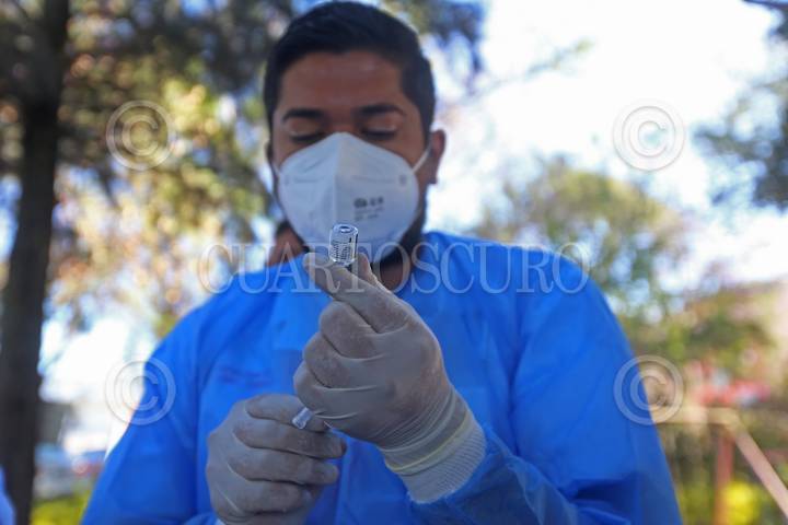 Una persona encargada de la inmunización, prepara una dosis del biológico de Pfizer-BioNTech anti Covid-19, para posteriormente ser aplicada.