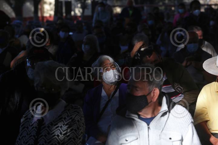 Personas de la tercera edad esperan su turno para la aplicación de la vacuna anti Covid-19.
