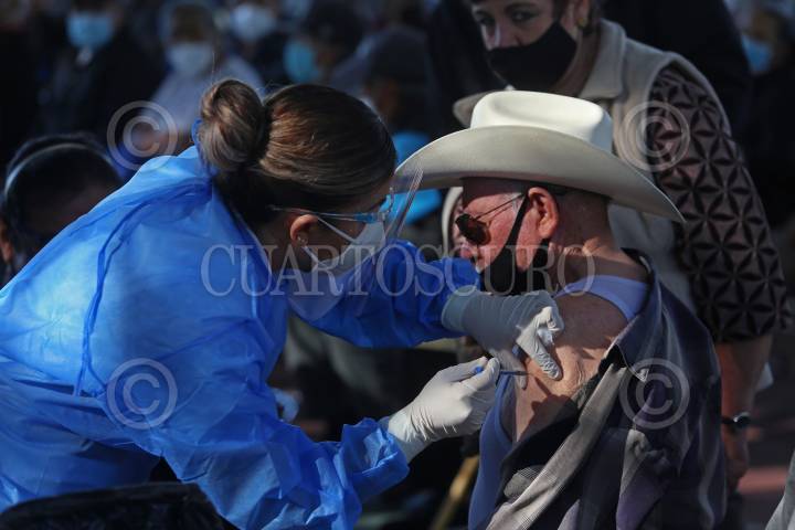 Una persona encargada de la inmunización, aplica una dosis del biológico de Pfizer-BioNTech anti Covid-19 a una persona de la tercera edad.