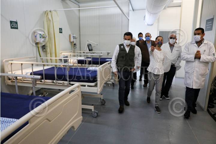 Claudia Sheinbaum, jefa de gobierno de la capital y Zoé Robledo, director del IMSS, recorren las instalaciones de la Unidad Temporal Morelos.
