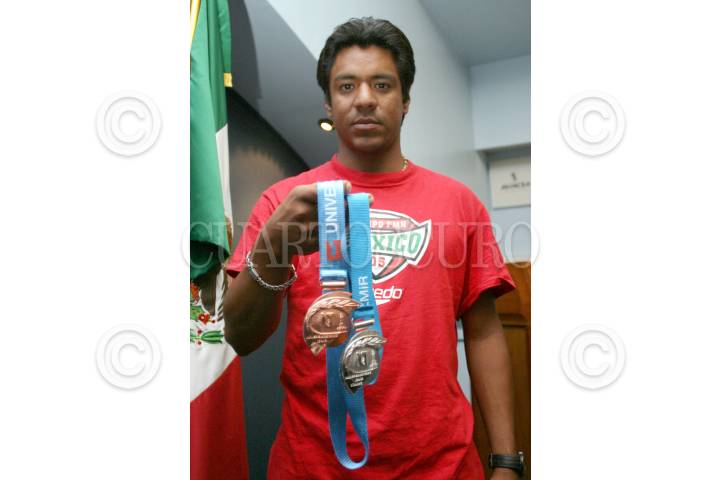 MEXICO, D.F. 23AGOSTO2005.- Omar Ojeda muestra las medallas que gano en la prueba de tiro con arco en Universiada 2005. FOTO: Nelly Salas/CUARTOSCURO.COM