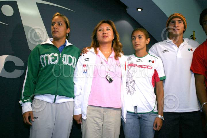 MEXICO, D.F. 23AGOSTO2005.- Los clavadistas Paola Espinoza, Magim (entrenadora), Jashia Luna y Romel Pacheco al termino de la conferencia de prensa que ofrecieron en el aeropuerto de la ciudad de México para hablar sobre su particpación en la Universiada 2005. FOTO: Nelly Salas/CUARTOSCURO.COM