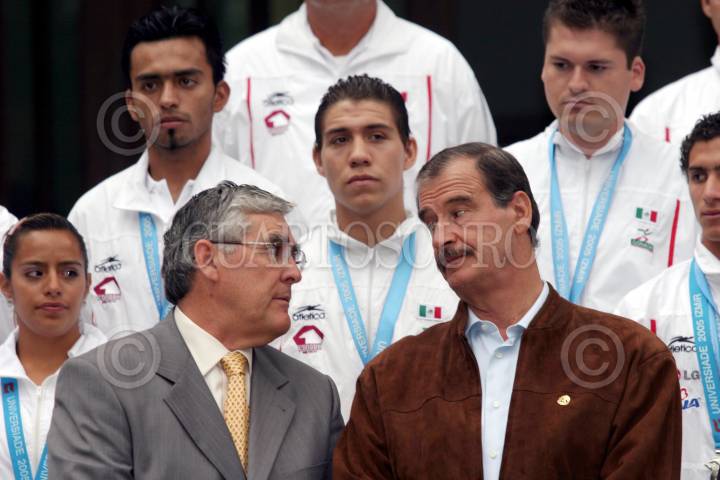 MEXICO, D.F., 24AGOSTO2005.- Vicente Fox, presidente de la Repùblica y Nelson Vargas, titular de la CONADE, durante la reunión con los medallistas de la Universiada en Turquía, en la residencia oficial de los Pinos. FOTO: Moisés Pablo/CUARTOSCURO.COM