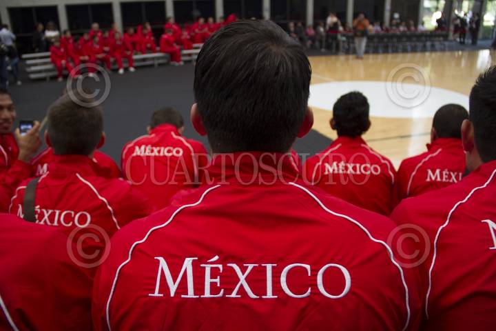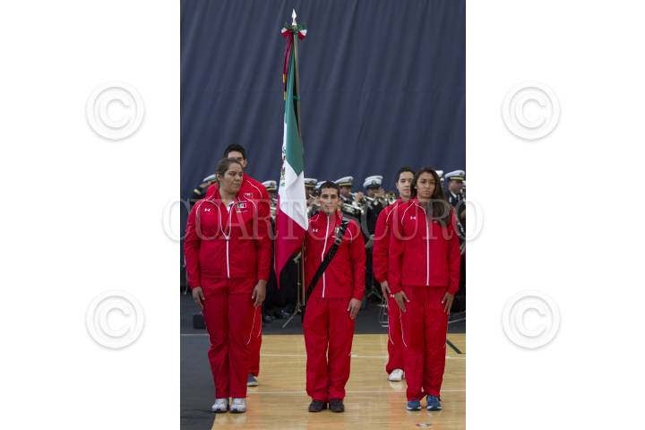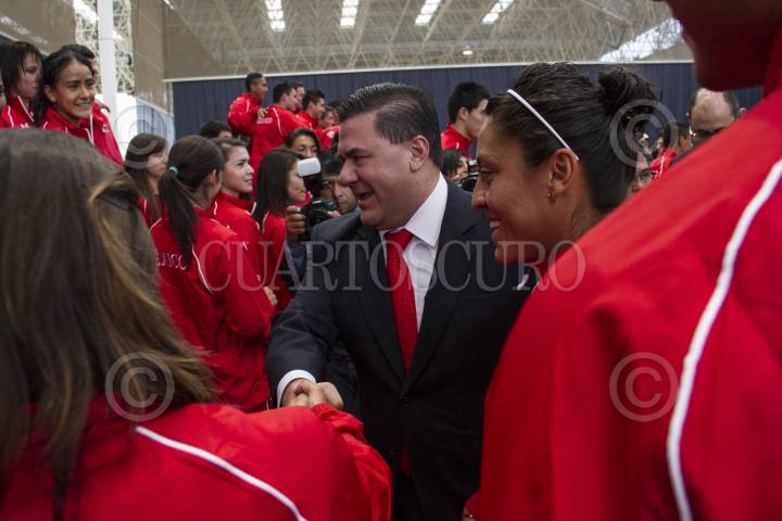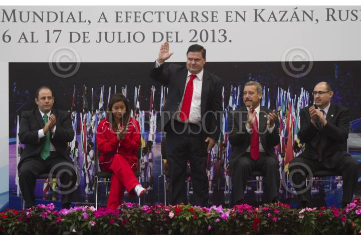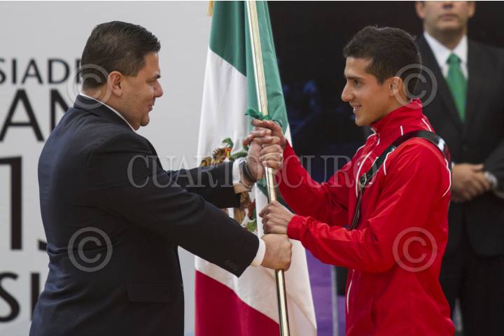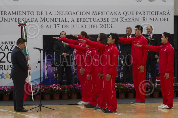MÉXICO, D.F., 28JUNIO2013.- La delegación mexicana que participará en la Universiada 2013, que se efectuará del 6 al 17 de julio próximo en Kazan, Rusia, fue abanderada por el director general de la Comisión Nacional de Cultura Física y Deporte (Conade), Jesús Mena, que entregó el lábaro patrio al clavadista Romel Pacheco. FOTO: MISAEL VALTIERRA / CUARTOSCURO.COM
