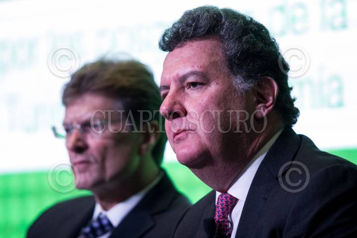 CIUDAD DE MÉXICO, 25ENERO2018.- Enrique de la Madrid Cordero, secretario de Turismo, y Pablo Azcarraga, presidente del Consejo Nacional Empresarial Turístico (CNET), durante la inauguración del foro “Perspectivas turísticas para México 2018”, evento que busca la exposición de proyectos y de nuevas iniciativas en el desarrollo de proyectos amigables con el medio ambiente en nuestro país. Asimismo, el secretario afirmó estar de acuerdo con la legalización de la marihuana en al menos dos estados, Quintana Roo y Baja California. FOTO: GALO CAÑAS /CUARTOSCURO.COM
