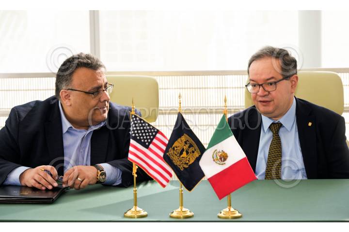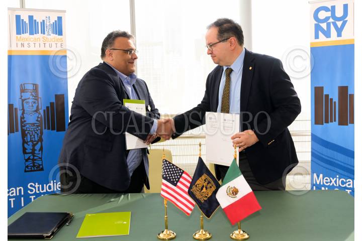 NEW YORK, ESTADOS UNIDOS. 11OCTUBRE2024.- El rector de la UNAM, Leonardo Lomelí Vanegas, y el presidente del Herbert H. Lehman College of the City University of New York (CUNY), Fernando Delgado, signaron hoy un convenio de cooperación académica, educativa y para promover relaciones de entendimiento mutuo. El documento incluye promover el intercambio de profesores, investigadores y de estudiantes; realizar escuelas de verano y/o programas dirigidos a profesores; además de efectuar investigaciones conjuntas, conferencias, talleres y otras acciones que acuerden las dos instituciones de educación superior. FOTO: UNAM/CUARTOSCURO.COM