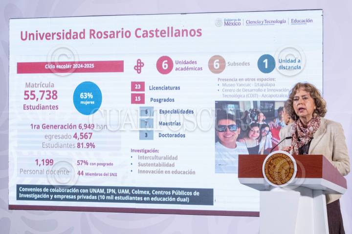 CIUDAD DE MÉXICO, 02DICIEMBRE2024.- Rosaura Ruiz Gutiérrez, titular de la Secretaria de Ciencia, Humanidades, Tecnología e Innovación, durante su exposición en la mañanera del pueblo en la cual dio a conocer que la Universidad Rosario Castellanos aumentará sus campus a varios estados de la República. FOTO: MOISÉS PABLO/CUARTOSCURO.COM
