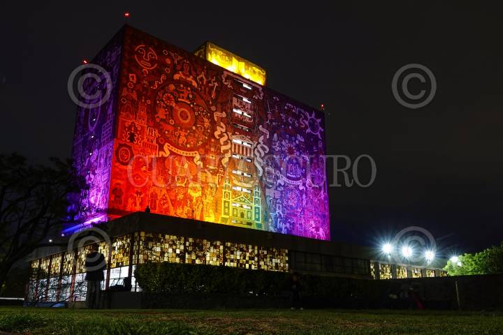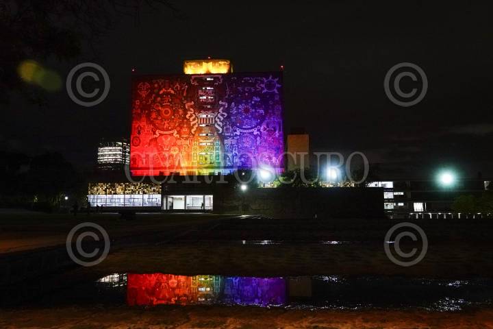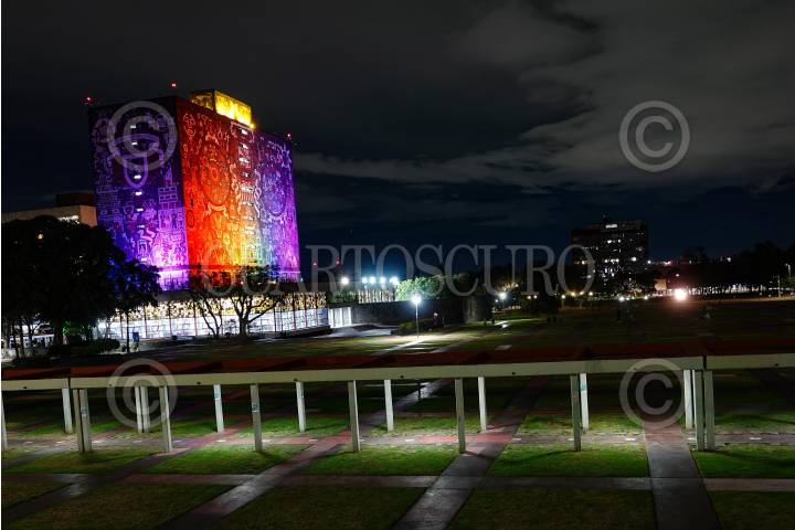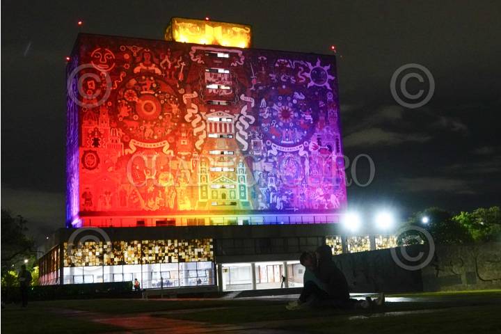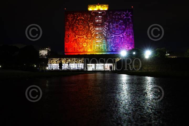 CIUDAD DE MÉXICO, 21JUNIO2024.- La Biblioteca Central de la Universidad Autónoma de México, se iluminó de los colores de la comunidad LGBTTTIQ+, esto en el marco del "Mes del Orgullo PUMA", con el fin de fortalecer los procesos para la construcción de espacios igualitarios, no discriminatorios y libres de violencia hacia las diversidades y disidencias sexogenéricas en la Universidad. FOTOS: ROGELIO MORALES /CUARTOSCURO.COM