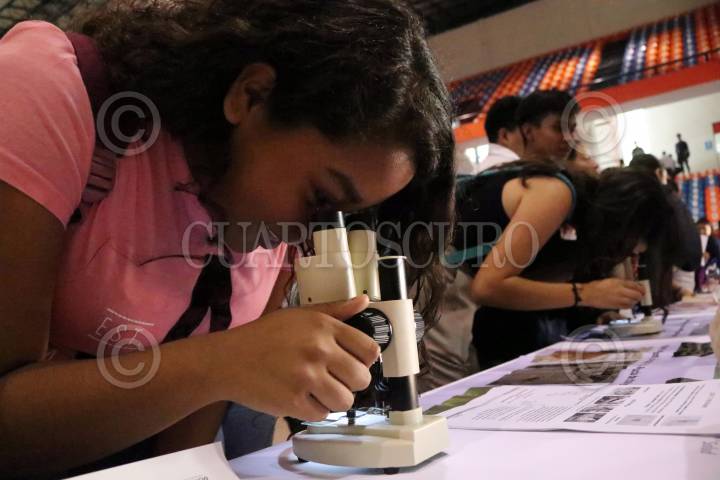 CUERNAVACA, MORELOS, 06NOVIEMBRE2019.- Una estudiante universitaria observa una larva de mosco con un microscopio durante la Jornada Nacional de Salud que se lleva a cabo en el auditorio de la máxima casa de estudios del estado. FOTO: MARGARITO PÉREZ RETANA /CUARTOSCURO.COM