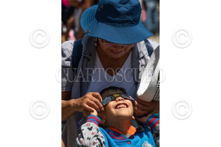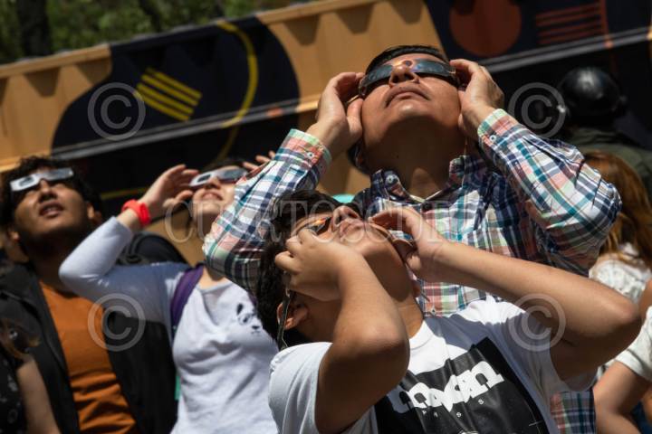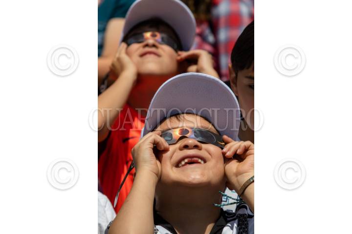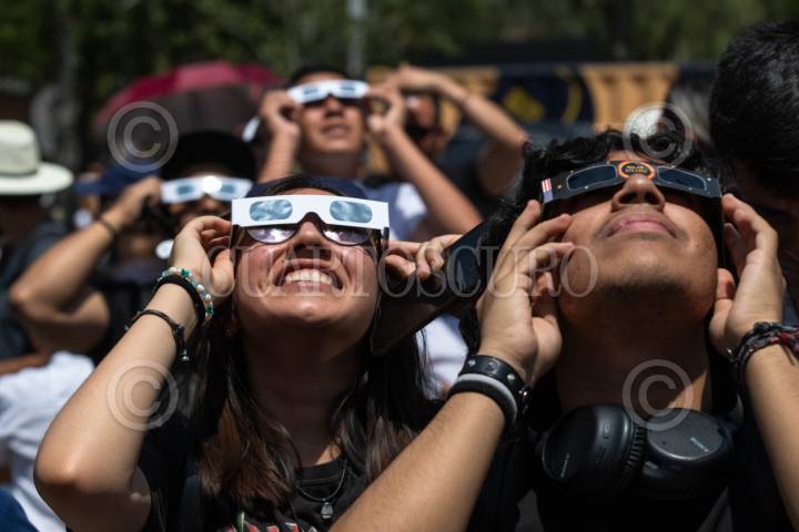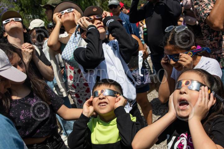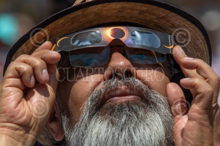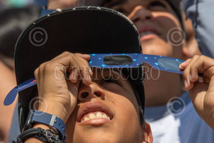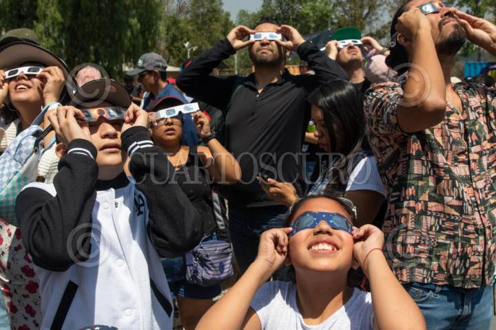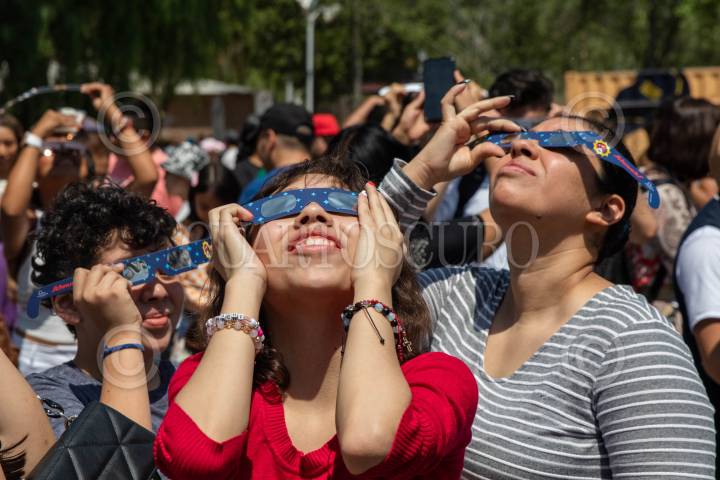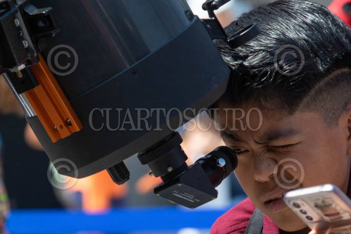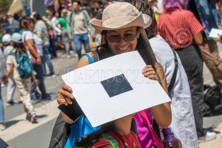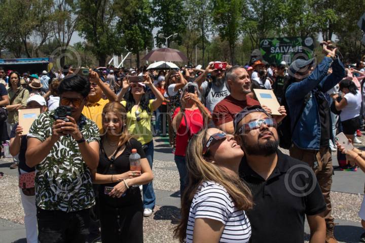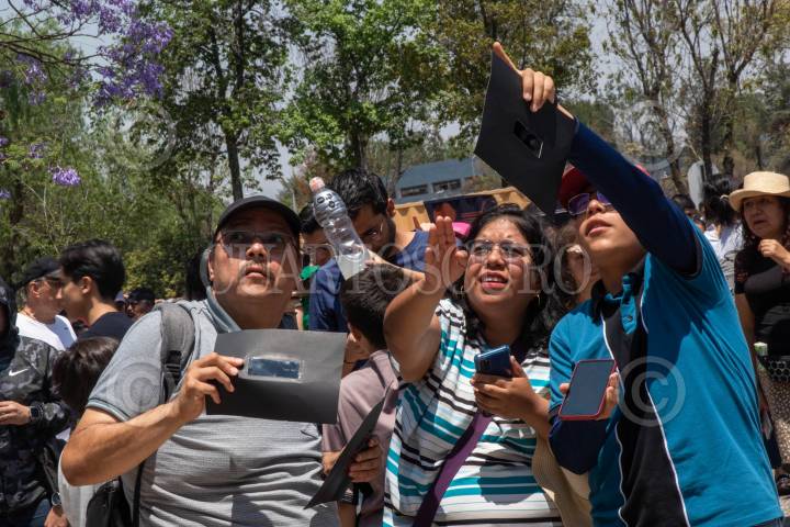 CIUDAD DE MÉXICO, 08ABRIL2024.- Gran espectacion a causado el eclipse solar en la Ciudad de México. Personas se reunieron en la explanada del Universum en Ciudad Universitaria para ver este fenómeno astronómico, se cancela que pasada las doce la luna oculte más del 70% la circunferencia del sol. FOTO: MOISÉS PABLO/CUARTOSCURO.COM