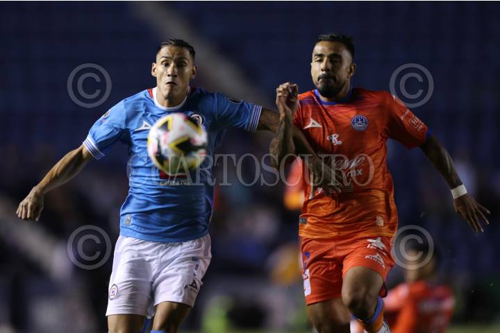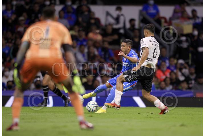 Uriel Antuna de Cruz Azul intenta centrar con la marca de Nicolás Díaz de Tijuana durante el partido de fútbol Cruz Azul vs Tijuana correspondiente a la jornada 9 del Torneo Apertura 2022 de Liga BBVA MX, en el estadio Azteca.