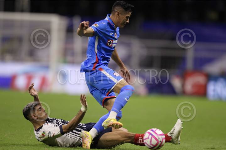 Germán Berterame de Monterrey se barre para quitar la pelota a Uriel Antuna de Cruz Azul durante el partido de ida Cruz Azul vs Monterrey, dentro de la fase de cuartos de final de la Liguilla MX, Torneo Apertura 2022, en el Estadio Azteca.