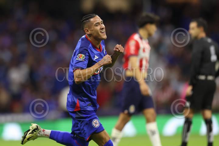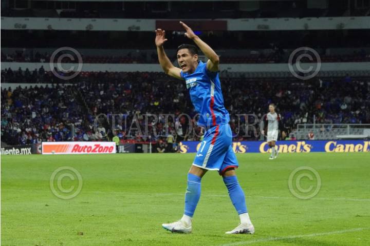 CIUDAD DE MÉXICO, 02MARZO2024. Uriel Antuna festeja así su segundo da anotación en el partido de fútbol Cruz Azul vs Guadalajara correspondiente a la jornada 10 del Torneo Clausura 2024 de Liga BBVA MX, en el Estadio Azteca. FOTO: EDGAR NEGRETE LIRA/CUARTOSCURO.COM