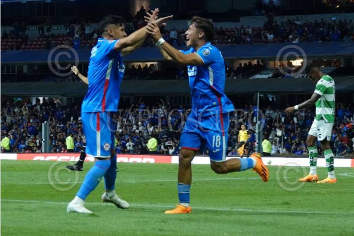 Los jugadores del Cruz Azul Uriel Antuna, mediocampista ofensivo, y Rodrigo Huescas, extremo izquierdo, celebran el tercer gol a su favor contra Santos en el Estadio Azteca